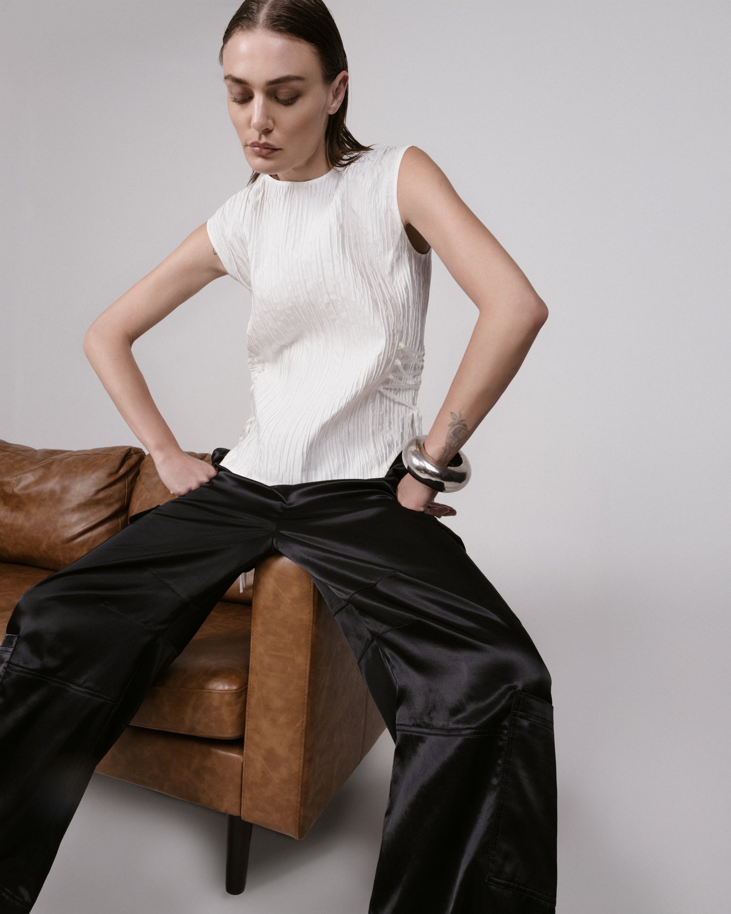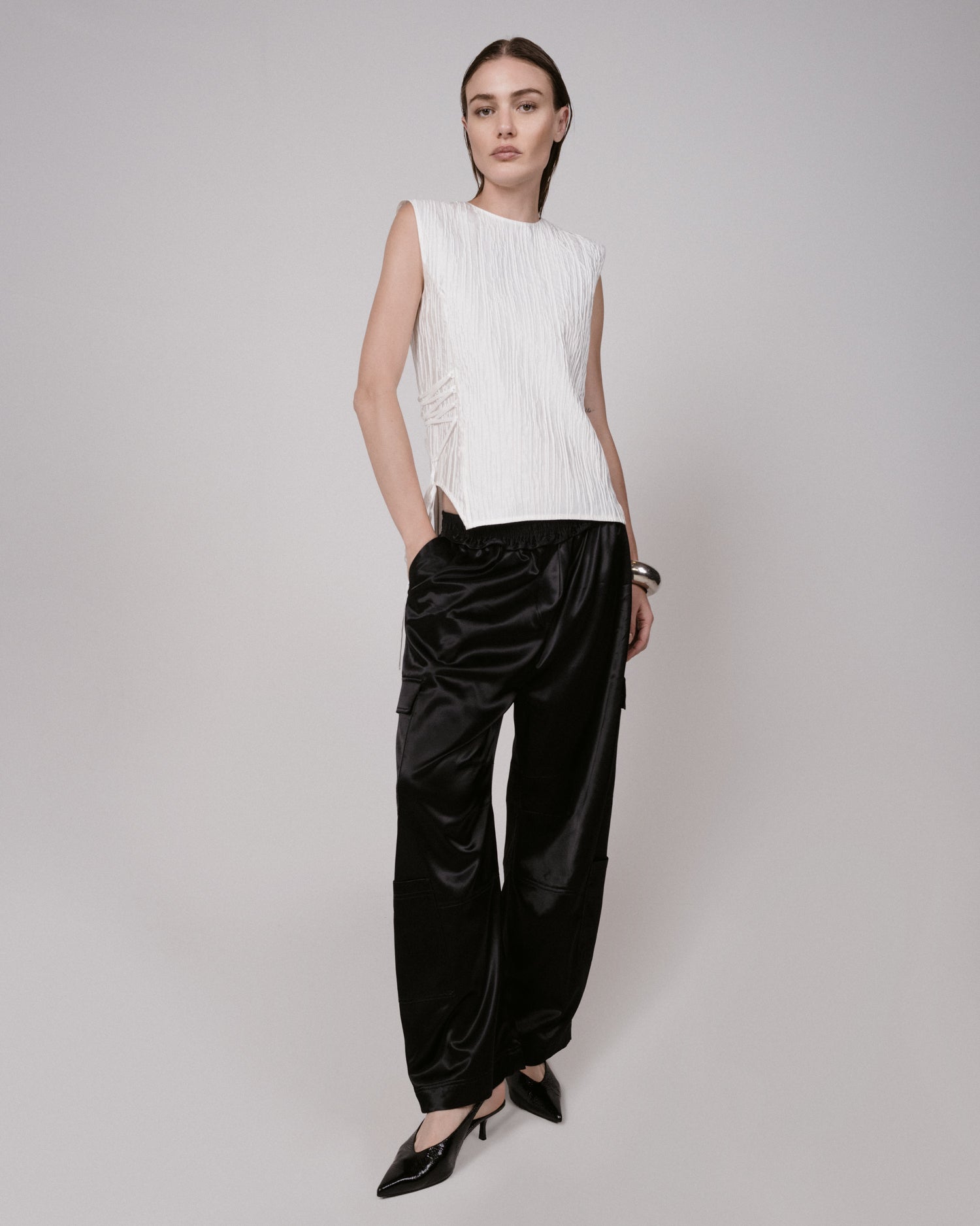 A classic muscle tee shape with our signature lace-up detail and shaped hem. Hidden zip closure.