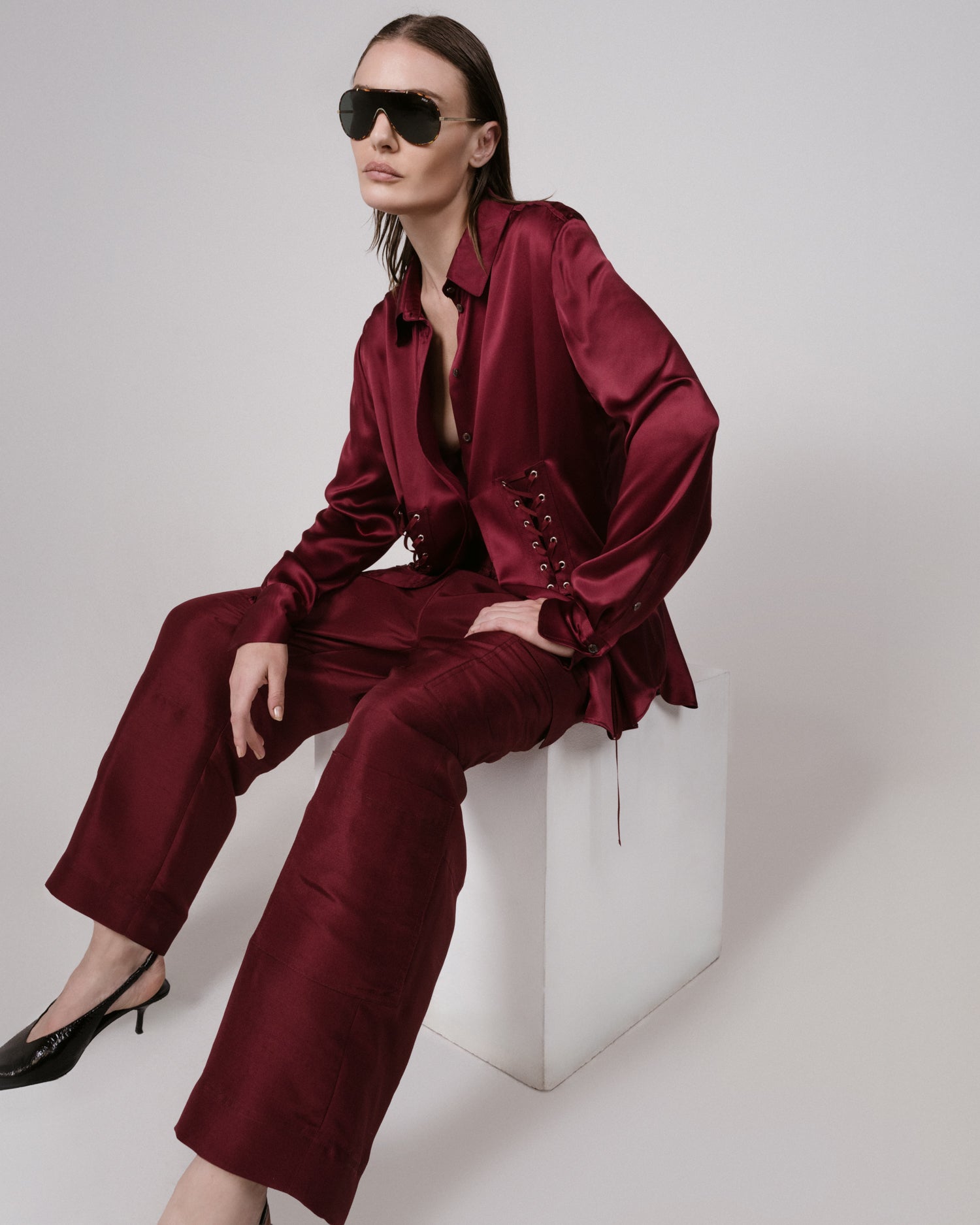 The KH classic button down shirt with lacing details, cut in a fluid silk charmeuse.